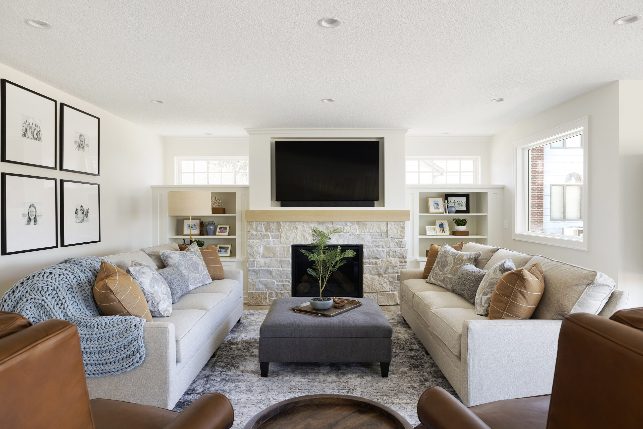 Furthermore, adjustments to the home’s layout improved the flow between living areas. This created a more open and connected environment. Additionally, in partnership with Custom One Landscaping, a new walkout patio was introduced. Accessible via sliding glass doors, this patio merges indoor comfort with outdoor beauty. It includes a cozy sitting area and beautifully landscaped views, encouraging more outdoor time.